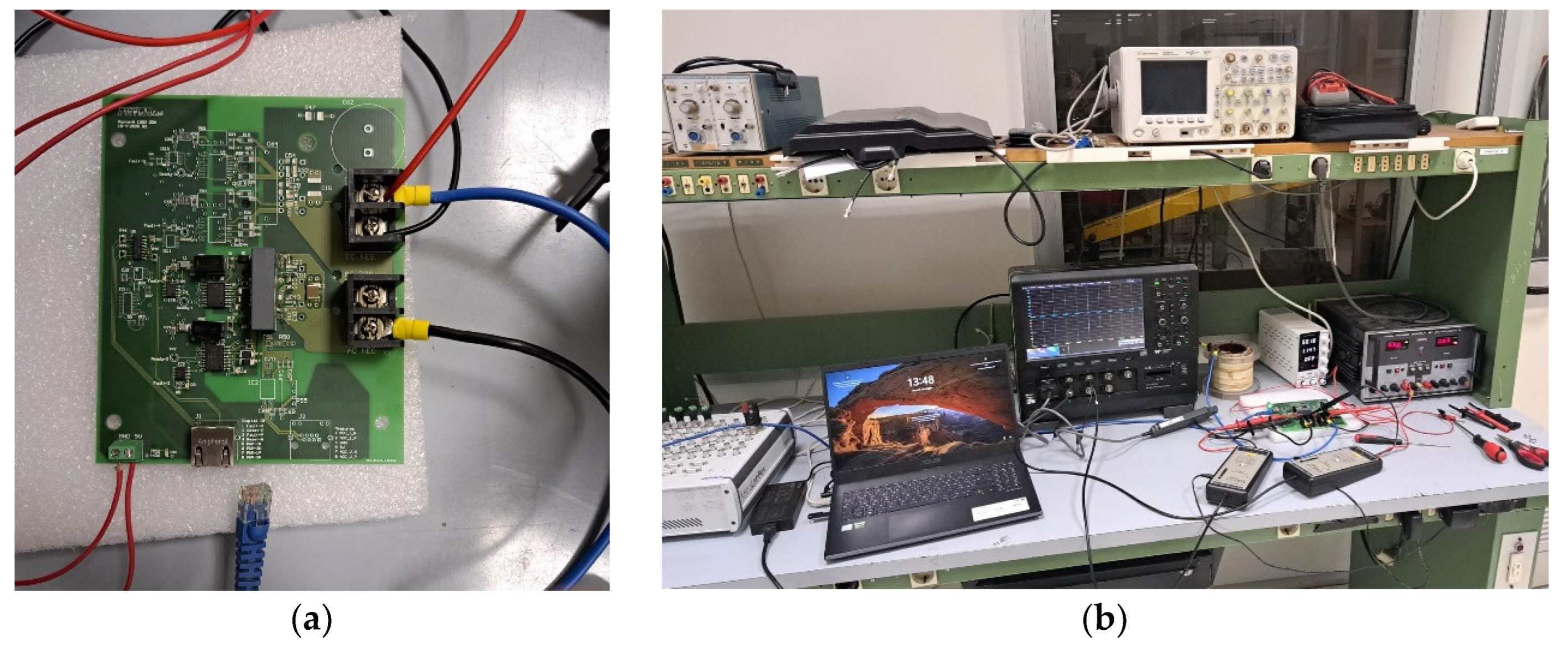 A power supply is used to charge the DC-link capacitors. The connection between dSpace and the PCB is made with an RJ45 cable. Please note that only the components of one leg are soldered; in fact, the tests are carried out on only one leg, since the design of the two legs is identical.