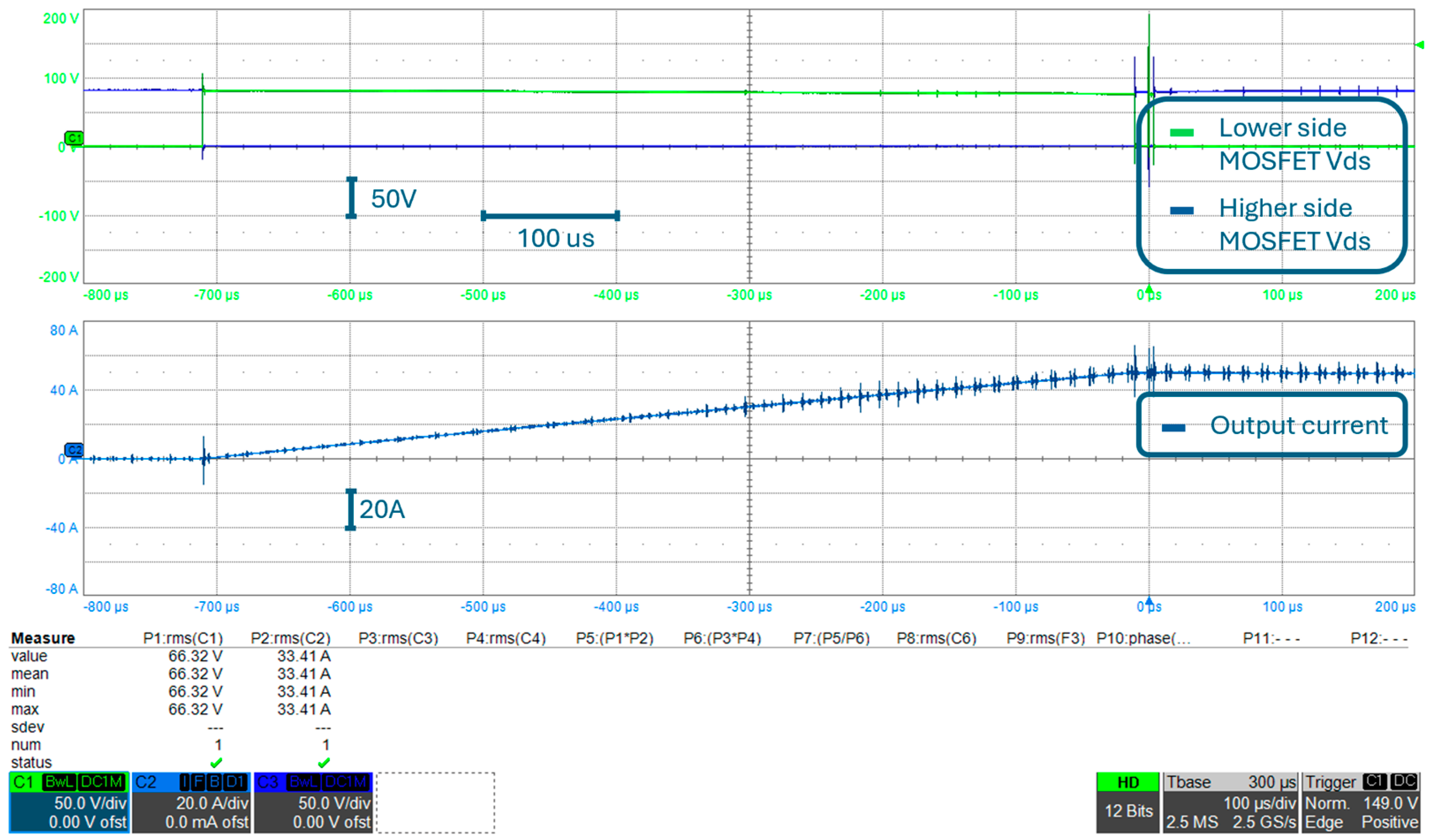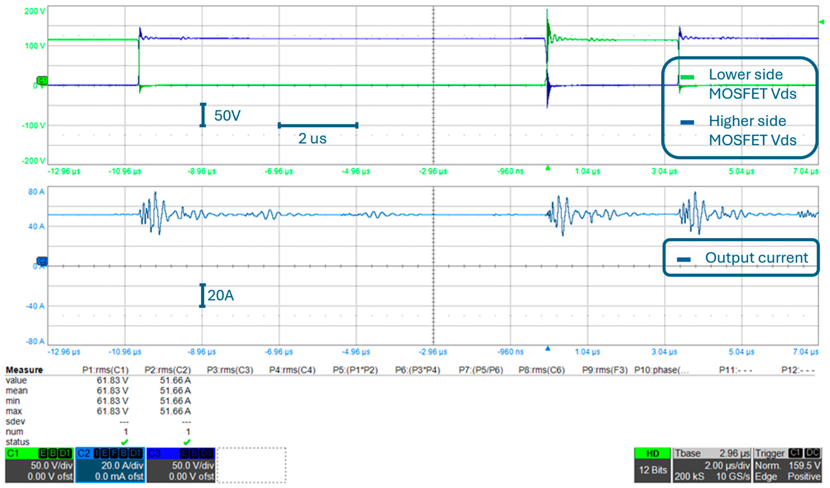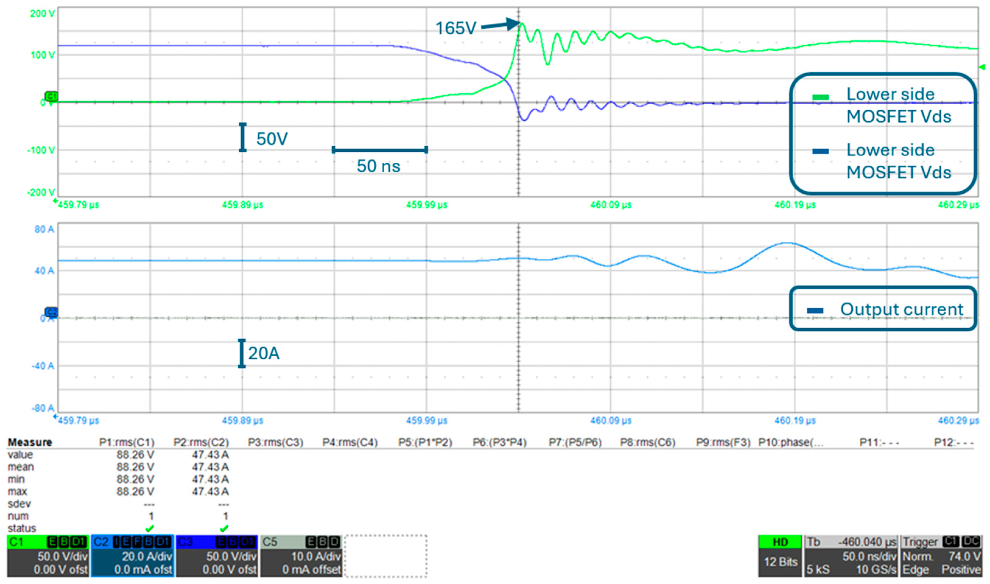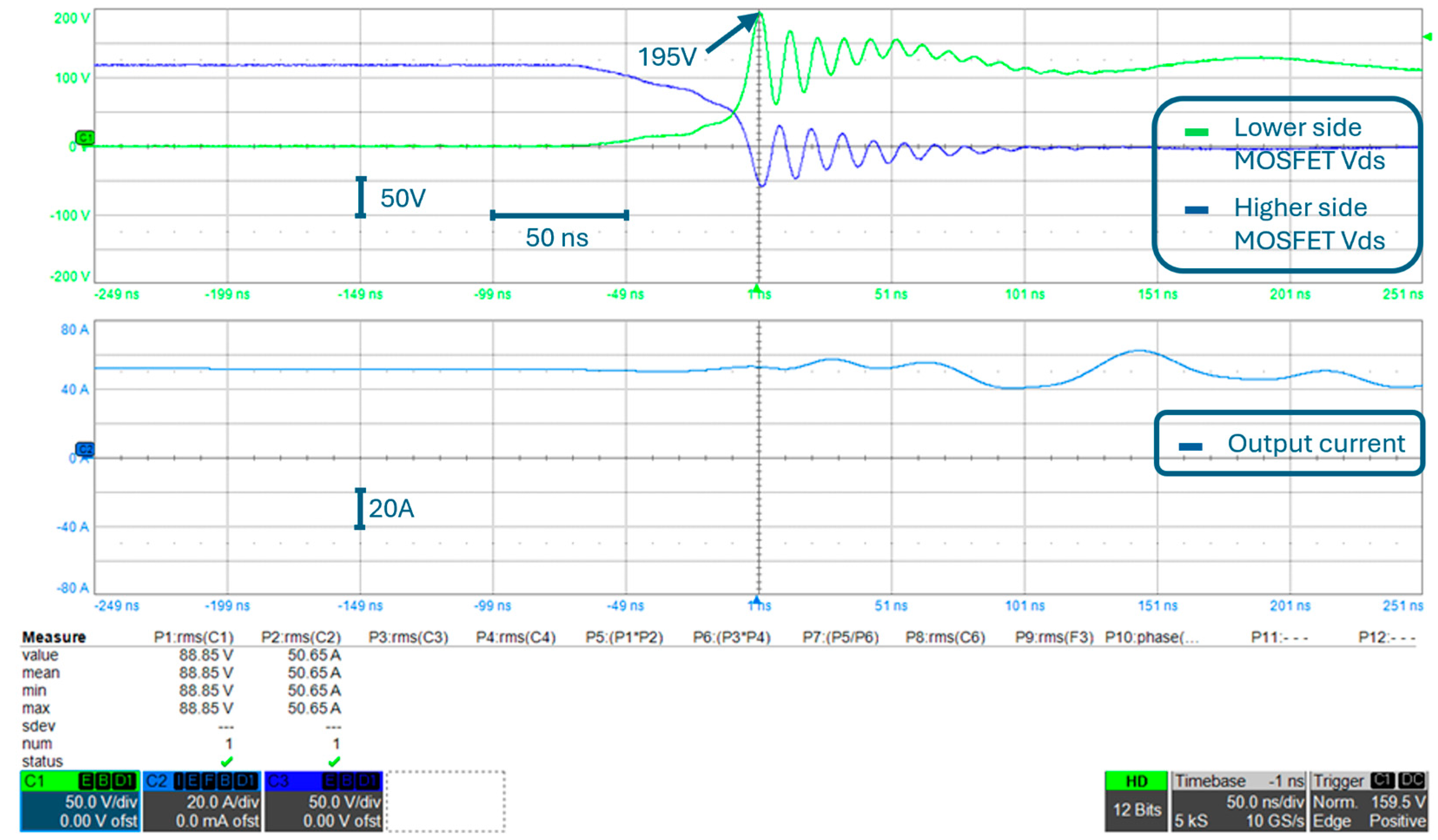 The first improvement that was tested was the addition of a 250 V-40 A Schottky diode in parallel to each MOSFET. The turn-on of the diode is faster than the turn-on of the MOSFET body diode, and therefore, the overvoltage during switching can be reduced to 188 V, even with the output current increased to the rated value (i.e., 50 A), as can be seen in