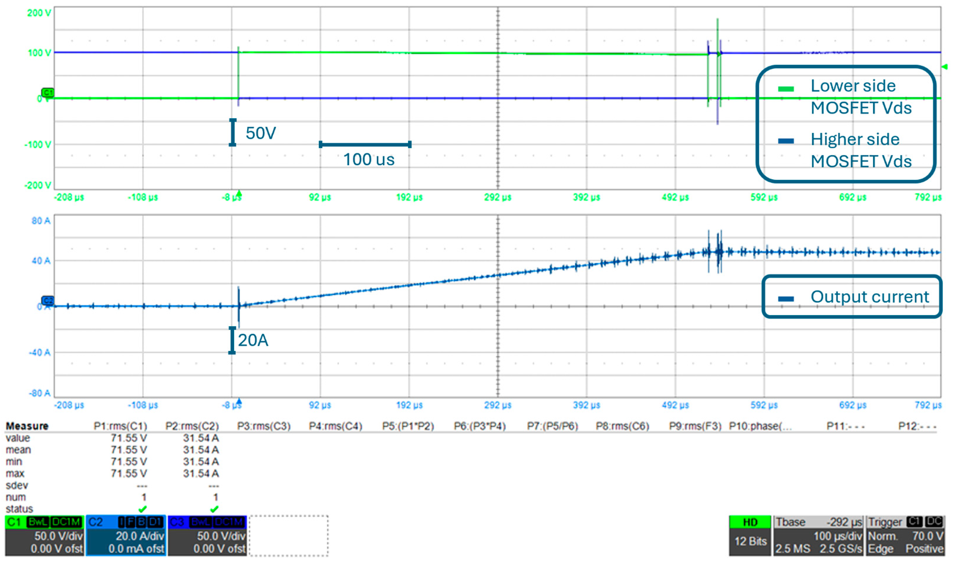 Since the overshoot is already close to the MOSFET rated voltage (i.e., 200 V), increasing the current would lead to MOSFET failure. For this reason, the converter leg was not tested at the rated current of 50 A. In the next paragraph, the test will be shown for a current of 50 A, and a reduction in the voltage overshoot will be shown. It is worth noting that for a fair comparison, the test should be carried out at the same current, since the voltage overshoot depends on the rate of current change. However, conducting the reference test at 25 A is a conservative approach, since the benefit derived from the introduction of the diodes in parallel to the MOSFET would be even more evident if both tests were conducted at the same current.