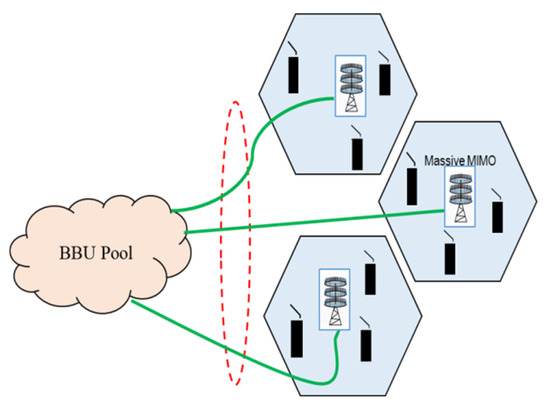 In 5G mobile communication, Cloud Radio Access Network (C-RAN) is a potential cellular communication network due to its high energy efficiency (EE) [1,2,3]. Compared to the conventional co-located antenna assembly containing baseband units (BBUs) and radio stations, the BBUs are located at the centre in C-RAN, which are attached to distributed remote radio heads (RRHs) through front-haul links [2,4]. In C-RAN, the transmission path between antennas and users is decreased, and a significant improvement of EE can be achieved. Massive multi-input multi-output (M-MIMO) will be able to connect with many users. Therefore, by offering high power gain, M-MIMO reduces the transmit power, which leads to increased SE as well as EE [5]. Hence, with a huge population of RRHs in a cell with a reduced transmission power, the efficiency of the network will be considerably improved. Moreover, linking each RRH with M-MIMO can achieve greater EE [6,7,8]. This raises the complexity gains of convectional MIMOs [1,6] and diminishes the interference between users’ access points [1]. In recent years, with green information technology, EE has attracted more attention. Thus, the resource allocation for EE maximization has attracted considerable attention [7]. The main purposes of C-RAN networks are to improve the EE, SE, and achievable rate of users. It can be performed by locating a huge number of RRH antennas, stated as M-MIMO, and achieving higher SE to 5G [4,8]. This balances the complexity gain of conventional MIMOs and eases the interference amongst users [1,9]. For example, the EE optimization problem related to the set of user numbers, antennas, and transmit power has been reported several times [7,8].