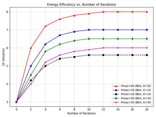 Figure 2 displays the system EE versus the iteration number. The EE achieved through the proposed algorithm was compared for the different users (K = 20 and K = 10) and transmit power constraints. As shown in Figure 2, under identical transmit power constraints, the proposed algorithm converges faster when the number of users K = 10, achieving stability within 10 iterations, compared to the slower convergence for K = 20. As seen from the figure, with fewer users (K = 10), the system achieves higher EE compared to scenarios with more users (K = 40), as resource sharing becomes more efficient. Overall, the figure confirms that the algorithm converges quickly and demonstrates clear trade-offs between transmit power, user load, and achievable energy efficiency. These comparisons validate the observation that smaller user numbers lead to quicker convergence.