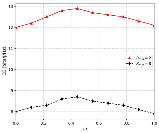 Figure 3 illustrates the EE against different ω values for = 2 and = 8 cases. The EE peak at ω = 0.4 results from an optimal trade-off between power allocation and data rate satisfaction; beyond this value, increased interference to meet higher QoS demands leads to EE degradation, which provides valuable insights for practical network design. As expected, the EE of the network decreases beyond ω = 0.4 for both = 2 and = 8 cases. When = 2 and ω is equal to 0.4, the EE of the network extends its maximum values, EE = 12.7 bits/J/Hz. Consequently, if we increase ω to 0.6, 0.7, 0.8, 0.9, and 1.0, the EE decreases in order: 12.28, 12.25, 12.2, 12.0, and 11.7-bits/J/Hz, respectively. Additionally, we can say that when we increase the weight parameter ω, the EE decreases. It means that beyond a maximum ω, the interference term increases progressively due to improved data rate requirements, and hence the degradation in the EE of the system occurs when increases. This is practical since extra power should be given to users to satisfy the QoS constraints.