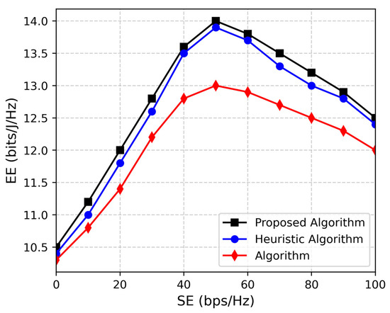 Figure 6 shows the EE- SE trade-off. We can perceive that as the throughput increases, EE also rises, but sharply decreases beyond a maximum. As throughput is a part of transmission power, a progressive increase in system throughput might cause larger power consumption as well. The maximum power consumption goes beyond SE, and the whole EE declines.