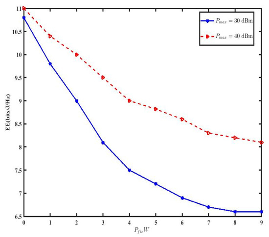 The main remark is that, in all three cases, the EE performances first increase and then remain unchanged when increases. When is small, the corresponding constraints have a strong impact on EE performances. However, when sufficiently is large, the other constraints lead to the performance. So, further increasing the transmit power budget for the network brings additional EE benefits. Compared to all three cases, = 40 dBm achieves good EE performances.