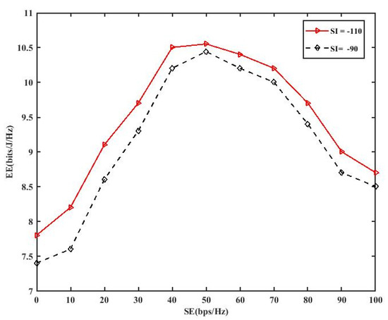 We also notice that the trade-off section falls as the value of the SI cancellation factors becomes lower. The explanation for this is forthright, and it is due to the small SI cancellation factors consuming extra power, which results in a lowering of the performance of SE as well as EE.