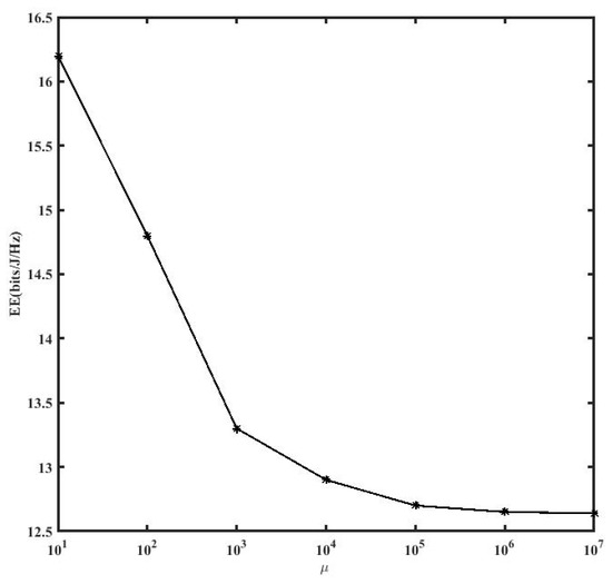 Figure 7 illustrates the role of weight parameters on system EE. This parameter aims to penalize the weight of the parameter in (27). It would increase the throughput of users and decrease power consumption. As the weight parameter increases, each RRH is allocated to one user, and the value would be either 0 or 1.