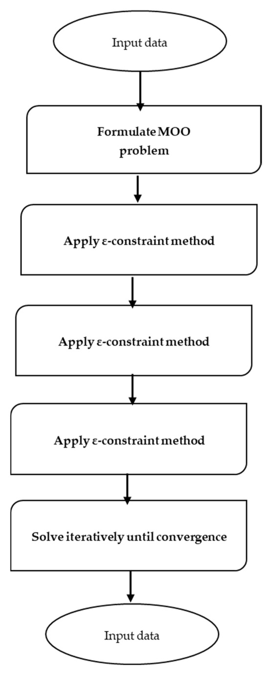 There are several benefits of -constraint method over the conventional method. (1) In linear problems, the application weight sum method to the feasible region provides a corner region with efficient extreme solutions. Thus, the weighting method requires a lot of iteration and a combination of weights while -constraint exploits almost every iteration to obtain a new and more efficient solution. (2) The weight sum method does not provide an unsupported efficient solution in non-linear MOO problems while -constraint method does. (3) The major benefit of the -constraint method includes managing numerous generated solutions by playing with the number of parameters in each objective function range, while it is not possible in the weighting method. The weaknesses of the -constraint method are choosing a perfect value for the epsilon vector, and demanding a large number space size for iterations to calculate the weighting method.