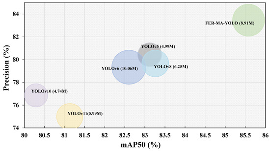 Figure 2. Comparative analysis of the proposed FER-MA-YOLO model against baseline YOLO models on the facial expression recognition dataset. The horizontal axis represents mAP50 (%), while the vertical axis displays Precision (%). The size of each data point corresponds to the number of model parameters (in millions, M), which is explicitly labeled next to each bubble to ensure precise interpretation of the performance–complexity trade-off.