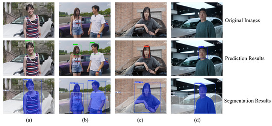 Extracting features for communication analysis from video frames: Identifying emotion via FER-MA-YOLO (prediction boxes) and quantifying key subject presence (e.g., humans and cars as shown) via Instance Segmentation (masks), with (a–d) representing four distinct car videos, respectively.