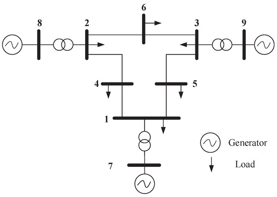 The IEEE 9-bus power system (as shown in Figure 1) is used to demonstrate the impact of dynamic LAA. The system parameters are extracted from Ref. [26]. The load buses are numbered 1, 2, 3, 4, 5, 6, and the generator buses are numbered 7, 8, 9. Suppose the load buses numbered 1, 3, and 5 are vulnerable to the dynamic LAA. The attack parameters are set as , , , , , and and , , , , , and . Through simulations, we investigate whether the dynamic LAA affects the grid frequency stability. The results are shown in Figure 2, Figure 3 and Figure 4. The notations , , and are the frequencies of the generator buses numbered 7, 8, and 9. From Figure 2, we can see that the grid frequency converges to the nominal value (i.e., 60 Hz) when the system is not targeted by the attacker, which indicates that the system is stable. From Figure 3, when the system suffers the dynamic LAA, the grid frequency deviates from the nominal value, which indicates that the system is unstable. Figure 4 shows the eigenvalues of the system. It clearly indicates that there are eigenvalues with real parts greater than 0 (i.e., 0.0049). These eigenvalues also validate the undermining of the grid frequency.
