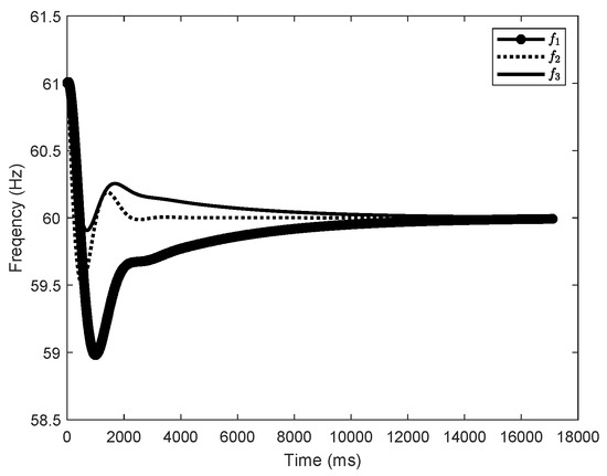 The grid frequency (, , and correspond to the frequencies of generator buses 7, 8, and 9, respectively) after the dynamic LAA (IEEE 9-bus).