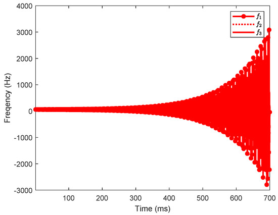 In contrast, Figure 8 shows the destabilizing effect of the dynamic LAA: frequencies and exhibit unbounded deviations, diverging exponentially from 60 Hz after 100 ms, with peaks exceeding ±2 Hz and no convergence observed even after 4000 ms. The other frequencies () show amplified oscillations but remain bounded, suggesting localized propagation of instability from the attacked load buses. This divergence aligns with the eigenvalue shifts analyzed in Section 5.1, where positive real parts emerge post-attack, confirming the LAA’s ability to undermine system damping and integral action. In conclusion, this subsection’s results underscore the vulnerability of grid frequency to dynamic LAAs, particularly in interconnected systems where load alterations at a few buses can cascade to affect multiple generators. The proposed method’s eigenvalue-based analysis (from Section 3 and Section 4) accurately predicts this instability, highlighting the need for targeted mitigation to restore negative real parts in eigenvalues and ensure frequency convergence.
