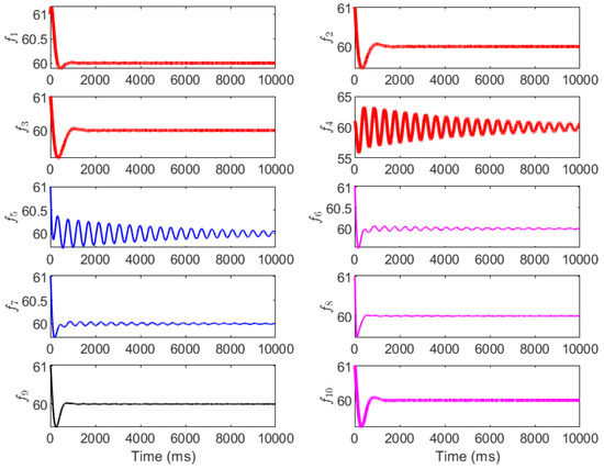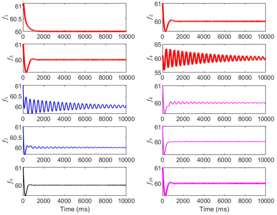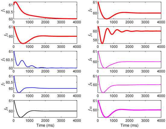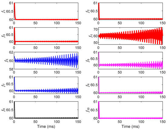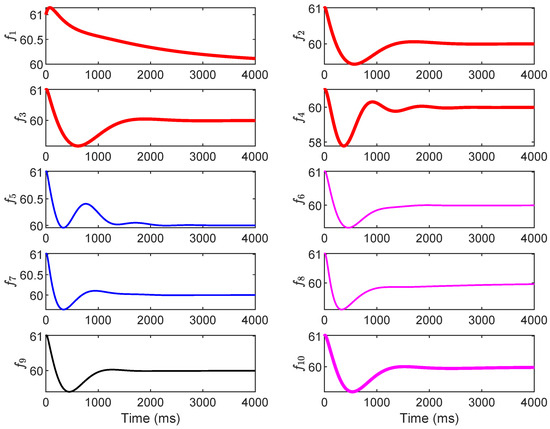 Next, the impact of the dynamic LAA on the grid frequency using the IEEE 39-bus New England power system is evaluated. By default, the frequency-sensitive load factors are set uniformly as . To simulate a realistic attack scenario, we assume the vulnerable load buses are numbered 6, 10, and 19, with adversarial load injections , , and . These injections represent moderate to severe modifications that could arise from compromised IoT devices or demand-response signals. The changes in grid frequency for generator buses 30–39 are illustrated in Figure 7 (no attack) and Figure 8 (under attack). The grid frequencies are denoted by , corresponding to these generator buses. In Figure 7, under normal operation without LAA, all frequencies converge smoothly to the nominal value of 60 Hz within approximately 2000–3000 ms, with initial deviations limited to ±0.5 Hz and exhibiting damped oscillations that decay rapidly, indicating inherent system stability due to the baseline PI control and damping ratios.