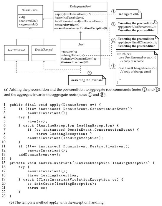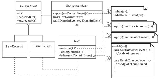 The abstract class EsAggregateRoot has three operations: apply, when, and addDomainEvent, all of which accept a DomainEvent object. Refer to note ➀ in the upper right corner of Figure 1. The template method apply defines the common processing steps enforced on the commands of concrete subclass User [30], including the abstract when operation, which is deferred to subclass User for processing the event, and the concrete addDomainEvent operation, which adds an event to the EsAggregateRoot and is reused by subclass User.