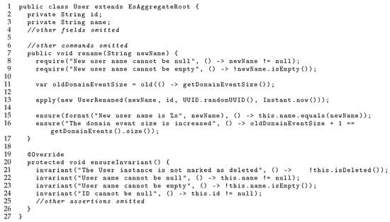 The rename command’s precondition asserts the newName parameter to be non-null and non-empty with the utility function require (lines 8–9); the value oldDomainEventSize captures the old domain event size for asserting the domain event size in postcondition with the utility function old (line 11); the postcondition asserts that the changed user name is equal to the newName and the domain event size is increased with the utility function ensure (lines 15–16); and the aggregate invariant asserts that the User instance is not marked as deleted, its attribute “name” is non-null and non-empty, and attribute “id” is non-null with the utility function invariant (lines 21–24).