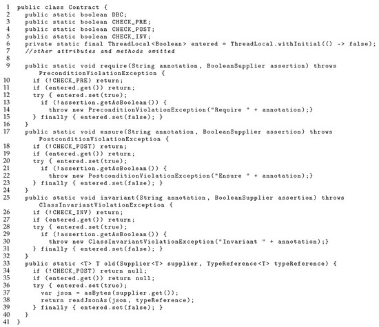 The methods require, ensure, and invariant (lines 9–16, 17–24, and 25–32) emulate Eiffel’s corresponding reserved words for contract specification. Each method takes two parameters: a string annotating the condition being checked and a lambda expression of type BooleanSupplier for the assertion. An assertion failure in require, ensure, and invariant raises an instance of PreconditionViolationException, PostconditionViolationException, and ClassInvariantViolationException, respectively (lines 13–14, 21–22, and 29–30). The failing assertion’s accompanying annotation is copied to the exception to indicate the cause of the contract violation.
