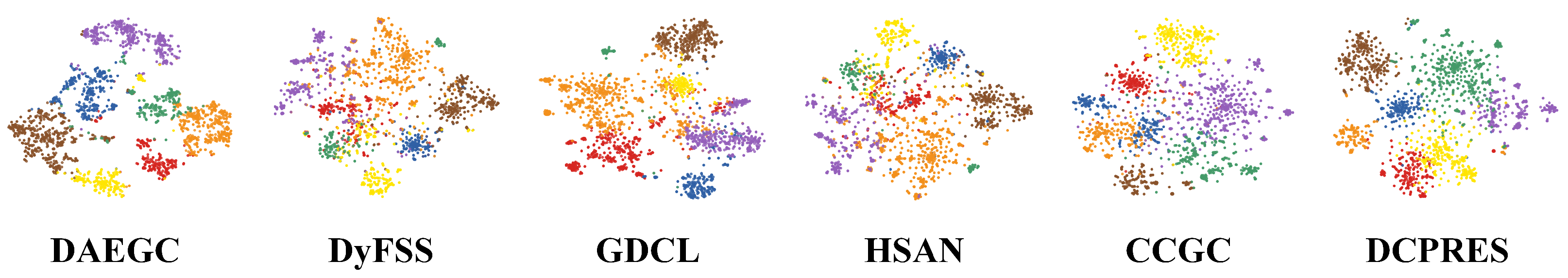 | Dataset | Metrics | DAEGC | DyFSS | DeSE | GDCL | DCHD | MAGI | CCGC | HSAN | DCPRES |