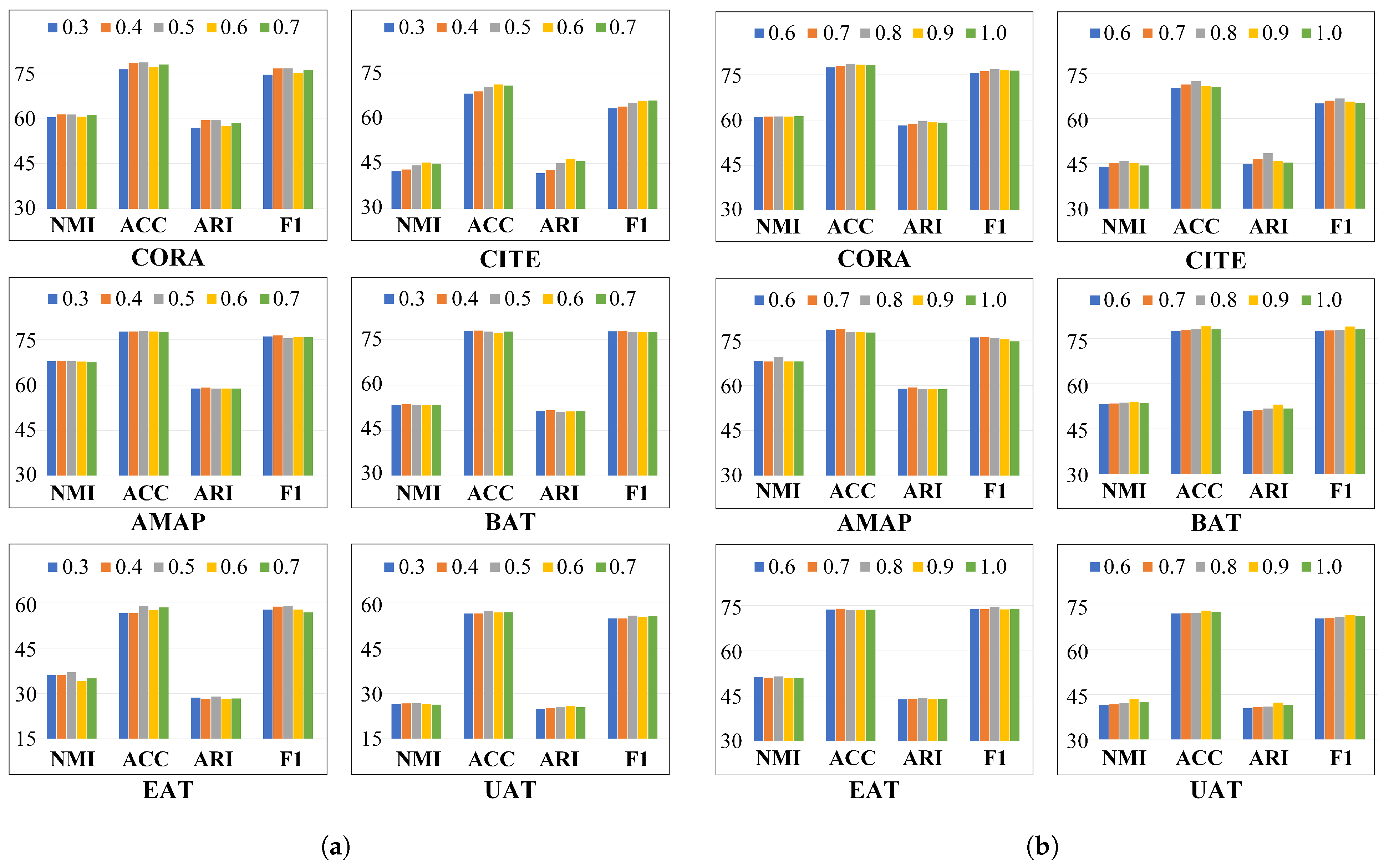 | CORA | NMI | 58.01 ± 0.46 | 59.48 ± 0.51 | 60.95 ± 0.42 | 61.07 ± 0.47 | 61.22 ± 0.37 | 61.18 ± 0.61 |