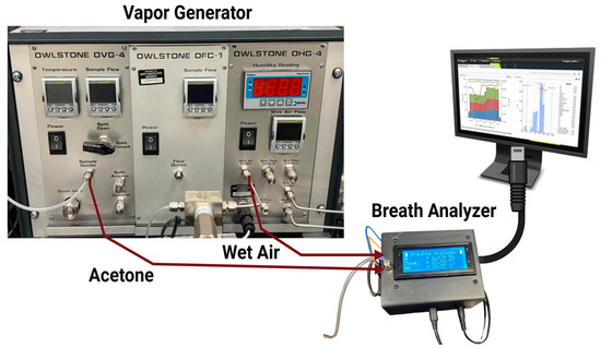 Data collection processes were conducted using a vapor generator, a breath analyzer (acetone sensor device), and a real-time data monitoring and storage system. The acetone vapor and relative humidity (RH) can be produced and controlled through an OVG-4 vapor generator and OHG-4 humidity generator, (Owlstone Inc., Westport, CT, USA), as shown in Figure 1.