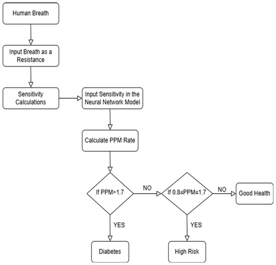 Our process started with capturing simulated human breath, which was evaluated for acetone concentration based on sensor resistance values. Diabetic patients typically have more acetone in their breath, while non-diabetic individuals have much less acetone. Based on these resistance measurements, the system calculated the sensitivity and determined the PPM (parts per million) of acetone from this data. Then, our model followed a sequence to classify patients: if the PPM is above 1.7, the patient was classified as diabetic; if the PPM is between 0.8 and 1.7, the patient was considered at high risk; and if the PPM is below 0.8, the patient was classified as in good health [21,22,23].