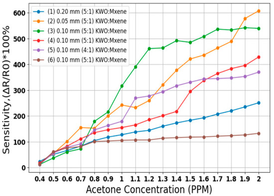 Figure 3 illustrates the sensitivity responses of various breath sensors made from KWO and MXene materials, tested at an average relative humidity of approximately 32% across acetone concentrations ranging from 0.4 PPM to 2 PPM. Six different sensor detectors were tested, emphasizing sensors composed of a KWO 5:1 MXene ratio due to their high sensitivity values. Sensors of different thicknesses, as well as sensors with identical thickness (0.10 mm) fabricated at different times, were compared.