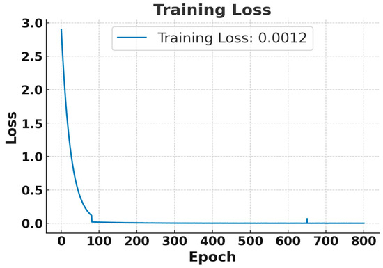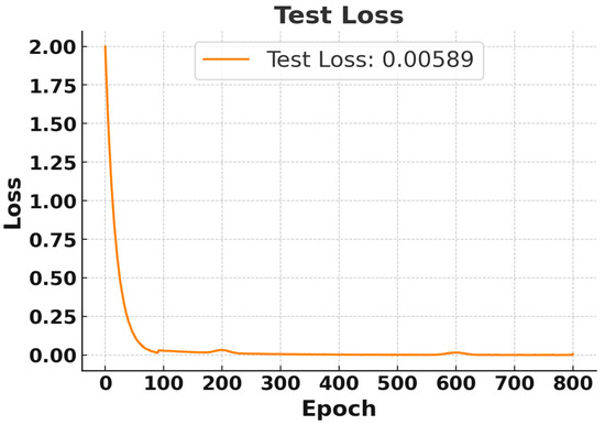 Although the model was trained for 20,000 epochs, both the training and testing losses converged and stabilized after approximately 600 epochs. Therefore, Figure 4 and Figure 5 present the loss behavior up to 800 epochs as a representative validation check. In Figure 4, the training loss began at the maximum and rapidly decreased after a few epochs, stabilizing near 0 after approximately 100 epochs. Finally, a training loss of 0.0012 was achieved, which indicates excellent performance on the training data [26]. Similarly, Figure 5 illustrates that the test loss also dropped significantly for the training process, and it stabilized at 0.00589, indicating that the model can generalize well to test data. So, both training losses and test losses show that the model effectively fits the data without overfitting, accurately predicting diabetes threshold status from simulated breath analysis data.