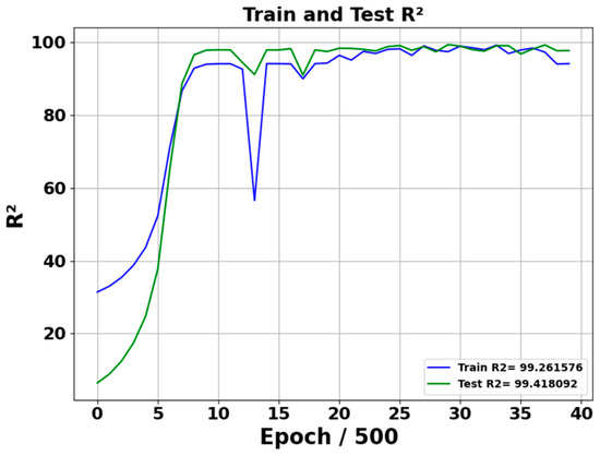 R2 Performance of model training and testing. Training and testing across 20,000 epochs; plotted at intervals of 500 epochs.