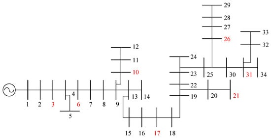 Figure 6 presents a schematic of the IEEE 34-bus test system, from which we extracted raw parameters and power dispatch information. Detailed information regarding the raw line impedance and shunt conductance is available in the literature [26]. The system’s base power and power/voltage ratings follow the specifications in [32]. The proposed voltage control strategy aims to regulate the bus voltage magnitude within the range of 0.95 to 1.05 p.u.