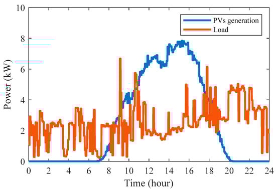 For simulation purposes, substation bus voltages are fixed at 1 p.u. To ensure realistic conditions, we incorporate PV generation and load profiles at a 1 min resolution, as illustrated in Figure 7. Further details on the DeePC-based algorithm parameters can be found in Table 1, while Table 2 provides the parameters of the BESS.