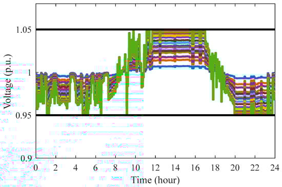 Scenario 3—Robustness Test: To demonstrate the robustness of the proposed control strategy, the proposed data-driven controller is tested under changed system conditions. Particularly, the output power of PV generation at each bus was reduced by 5%, and the BESS was reallocated from buses 3, 6, 10, 17, 21, 26, and 31 to buses 4, 7, 11, 18, 22, 27, and 32. The resulting bus voltage profiles are presented in Figure 12. A comparison between Figure 9 and Figure 12 demonstrates that the proposed data-driven control method effectively mitigates voltage violation issues, maintaining control robustness despite changes in system parameters and network topology.