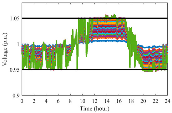Scenario 1—Basic Effectiveness Test: The disparity between PV generation and peak load demand heightens the vulnerability of distribution network to over-voltage conditions during midday and under-voltage in the evening. This effect is depicted in Figure 8, where voltage deviations are highlighted. In the absence of control strategy, the 34-bus test system undergoes significant voltage violations, resulting in bus voltages surpassing acceptable operational thresholds. Figure 9 presents the daily voltage profile achieved with the proposed data-driven control scheme. By analyzing the voltage control outcomes, it is evident that the proposed control strategy effectively maintains most bus voltages within the permissible range of 0.95 to 1.05 p.u.