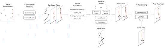 The DA-TCN based track initiation method proposed in this paper constitutes a complete processing flow as shown in Figure 1. The process takes raw radar measurements as input and outputs confirmed, conflict-free target tracks, which mainly consists of four stages: