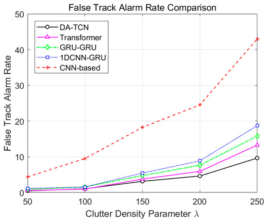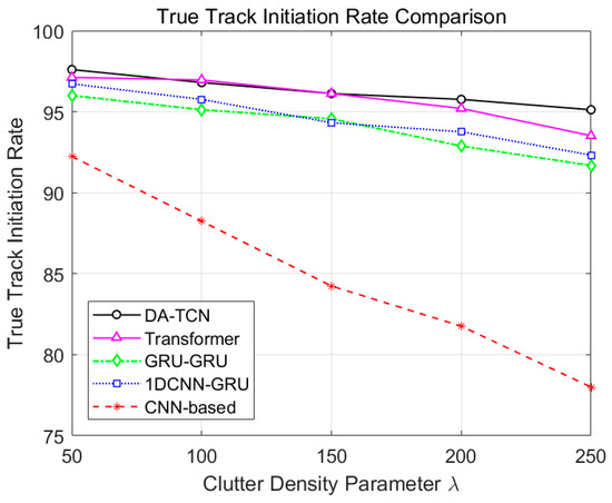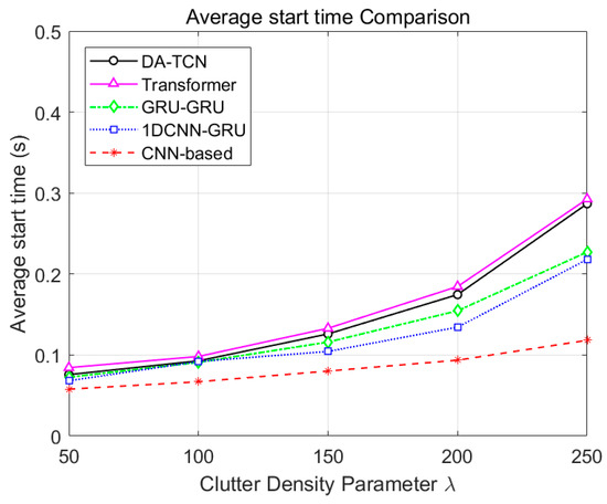 In terms of the Average Start Time : the time consumed by all algorithms increases with the increase in clutter density, which is due to the increase in the number of candidate tracks. DA-TCN exhibits better performance than the Transformer in this regard, but due to their more refined architectures, both have slightly higher computation times than the other baseline models. However, this increase is moderate and does not show exponential growth, indicating good scalability. Considering the great improvement of DA-TCN in the two key performance metrics of and , especially the strong suppression of false tracks in strong clutter environments, this moderate increase in computational cost is reasonable, and its overall efficiency is still within the real-time requirements of most radar systems.