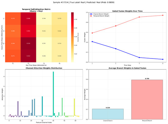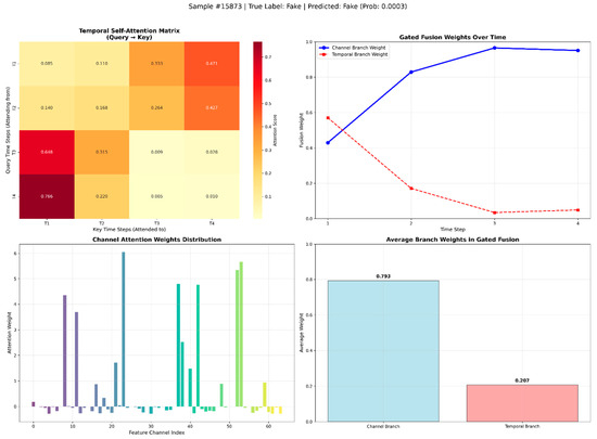 To gain deeper insight into the internal decision-making process of the DA-TCN model and to verify its interpretability, this study conducted a visualization analysis of the model’s temporal attention matrix, channel attention weights, and gated fusion weights. Figure 8 and Figure 9 show representative visualization results for a true track and a false track, respectively, clearly revealing the model’s attention distribution and fusion strategy across different dimensions.
