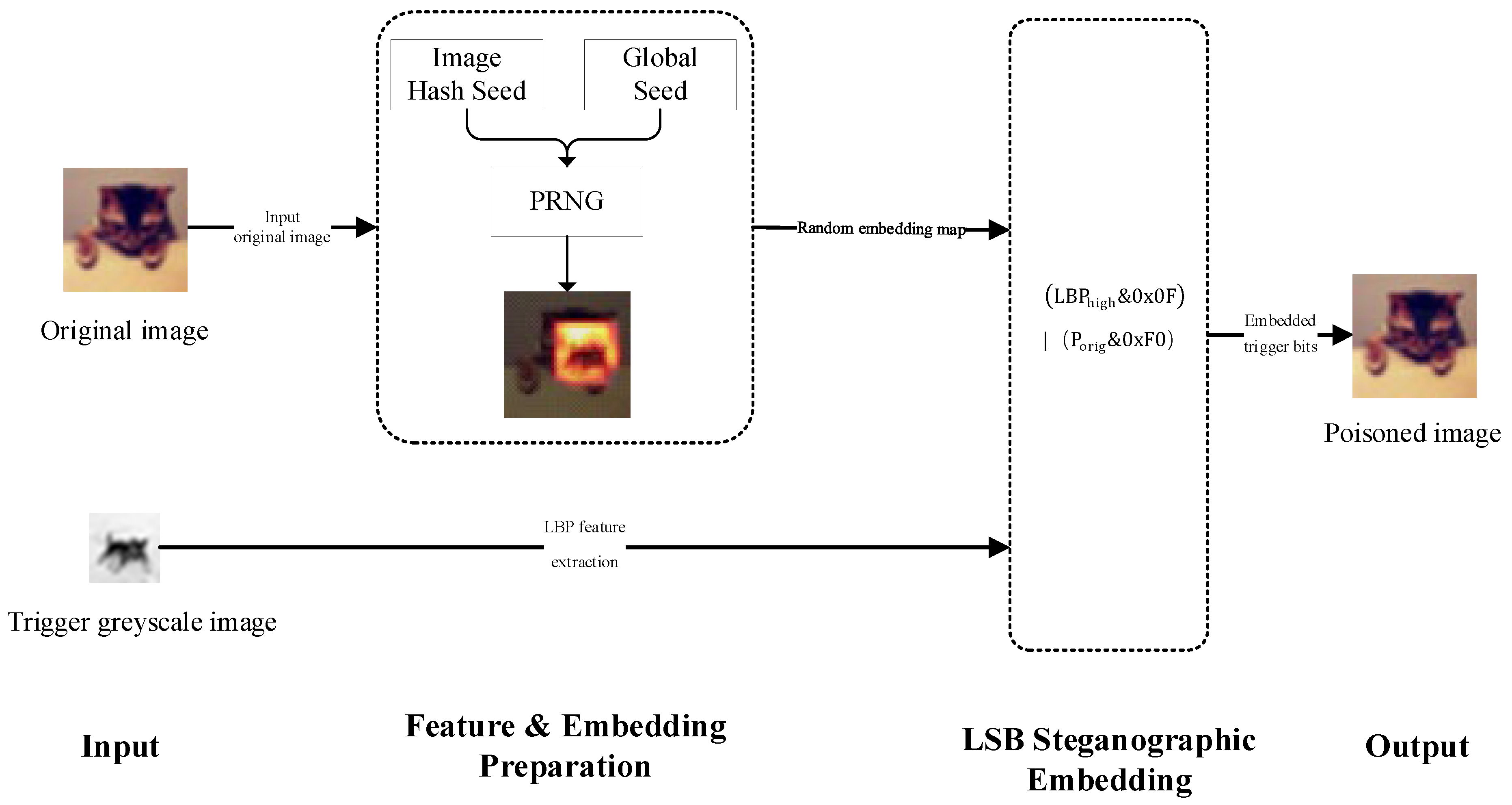 - We propose a complementary LBP–LSB invisible-trigger generation method, where LBP encodes local texture structure and LSB maintains visual imperceptibility, and their synergy enhances trigger robustness.