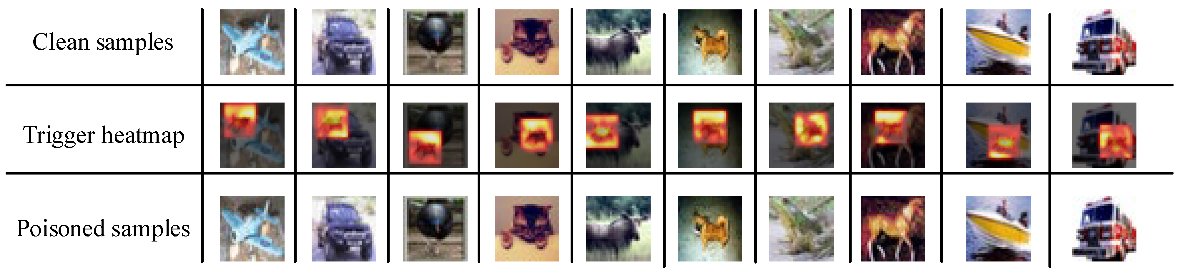 - Wu, B.; Chen, H.; Zhang, M.; Zhu, Z.; Wei, S.; Yuan, D.; Zhu, M.; Wang, R.; Liu, L.; Shen, C. Backdoorbench: A comprehensive benchmark of backdoor learning. Adv. Neural Inf. Process. Syst. 2022, 35, 10546–10559. [Google Scholar] [CrossRef]