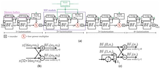 In addition, it is worth noting that the summation in (8) corresponds to the 64-point DFT of the quantity BF2(n3)·. This observation suggests that the DFT can be iteratively factorized until no further decompositions are possible, having 64-point, 16-point, and 4-point DFTs in our case. Twiddle factors for 64 and 16-point DFTs are in the form , , respectively, with apex i on factorized indices that indicate the iteration number. At the same time, twiddle factors equal 1 for the 4-point DFT.