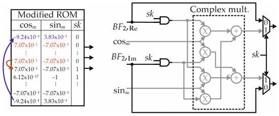 Modified ROM and skipping circuit for multiplications with trivial values of the twiddle factors. Terms BF2,Re and BF2,Im are the real and imaginary parts of the signal computed by the butterfly BF2, while cosm and senm are the modified cosine and sine coefficients. The blue and red arrows depicted near the ROM show when the FFT enters and exits from the skipping condition.