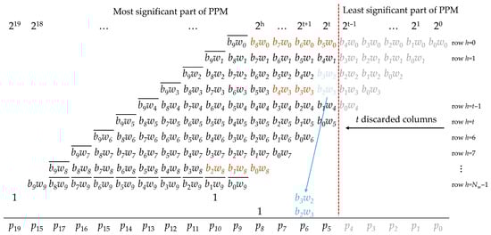 To define the amount of truncation, we first divide the multiplier rows into three groups based on the weight of their least significant bit (LSB). In the following, we refer to h as the row index, for h = 0, 1,… Nw − 1, with Nw being the number of bits of sine and cosine coefficients. Then, referring to Figure 3, we have that: