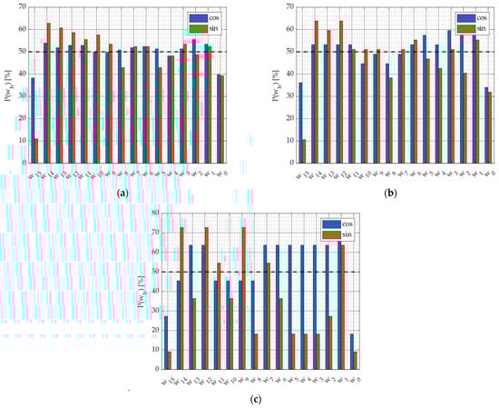 The dashed black line highlights the probability level of 50%, taken as a reference. The figure points out that some bits are high with low probability, making room for approximation. For example, bits w13, w10, w8, w6, w5, w4, w3, w2, w0 of the sine in Figure 4c exhibit P(wh) less than 40%, with w0 showing the lowest probability (less than 10%). Supposing to have P(bj) = 50%, the probability of having bjw0 = 1 is lower than 5%. Accordingly, partial products of the kind bjw0 can be truncated to gain hardware performance without dramatically degrading the accuracy of results. Similarly, bits w14, w11, w10, w9, w8, w0 of cosine are worth attention, as well as the central bits of sine and cosine in Figure 1a,b.