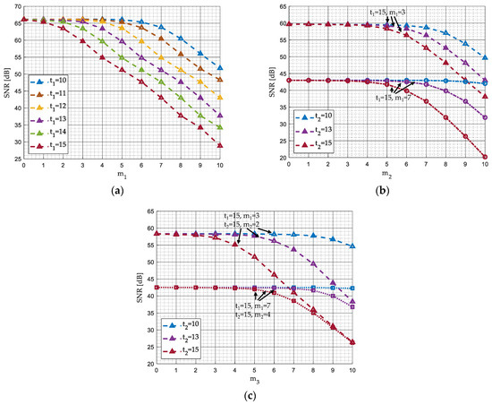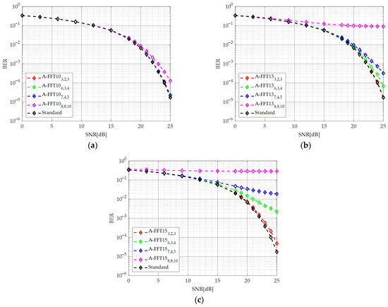 Bit Error Rate registered for channel SNR in the range 0 dB−25 dB using proposed FFT processors with (a) t = 10, (b) t = 13, and (c) t = 15 and four different configurations of m parameters.