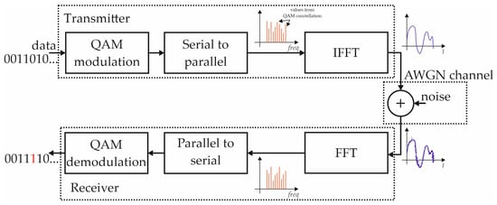 In telecommunication, Orthogonal Frequency Division Multiplexing (OFDM) is a technique widely employed for data transmission and reception, which allows for achieving high bit rates with optimal bandwidth occupation. Among different advantages, OFDM is resilient to inter-symbol interference and path fading, becoming one of the best choices for effective communication in modern transceivers. In the OFDM approach, the transmitted information is allocated to different subcarriers. Then, the receiver finds the subcarriers’ content in order to recover the desired data. Figure 6 shows a simplified block diagram representing the transmitter, the receiver, and the communication channel, modeled with Additive White Gaussian Noise. As shown, the direct and inverse Fourier transformations occupy a central role in the definition of the OFDM signal. In the transmitter, the bitstream is mapped through a digital modulation, like the Quadrature Amplitude Modulation (QAM) of Figure 6. Then, each symbol obtained from the digital modulation is placed on a subcarrier and transformed into the time domain by means of the inverse FFT (IFFT). At the same time, the FFT allows for finding the content of subcarriers in the receiver. Then, a demodulator rebuilds the bitstream starting from the received samples.