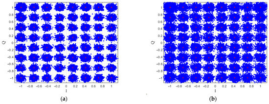QAM constellation after the transformation and demodulation with SNR = 25 dB, computed with FFTs (a) A-FFT153,2,3 and (b) ASRoBa.