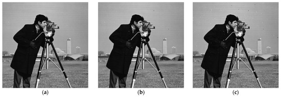 (a) Original “Cameraman” image and results after the processing with (b) A-FFT153,2,3 and (c) ASRoBA.