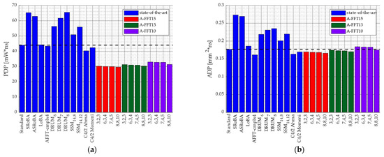 (a) Power-delay-product and (b) area-delay-product for the investigated FFT processors. The black dashed line highlights the PDP and ADP levels of the standard implementation.