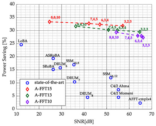Finally, Figure 11 compares accuracy and power behavior with the aim of offering a joint assessment between hardware performance and precision of calculations. Implementations close to the top-right corner of the figure exhibit the higher SNR with the higher power reduction. Performance of A-FFT10, A-FFT13, and A-FFT15 implementations is highlighted by the dotted lines. As shown, the proposed designs offer the best power-accuracy trade-off in all cases, allowing the possibility to achieve the largest power saving in a wide range of accuracy.
