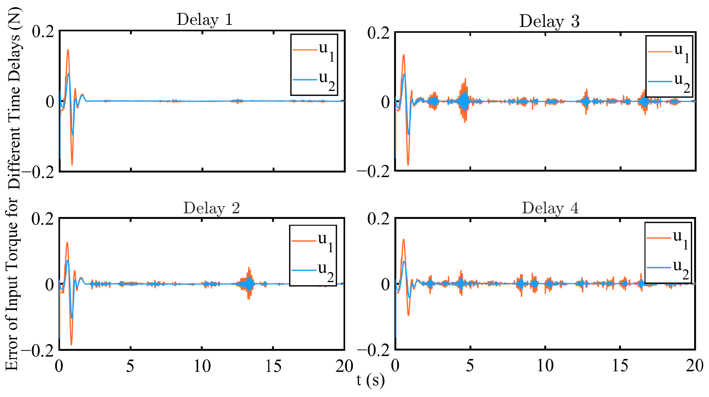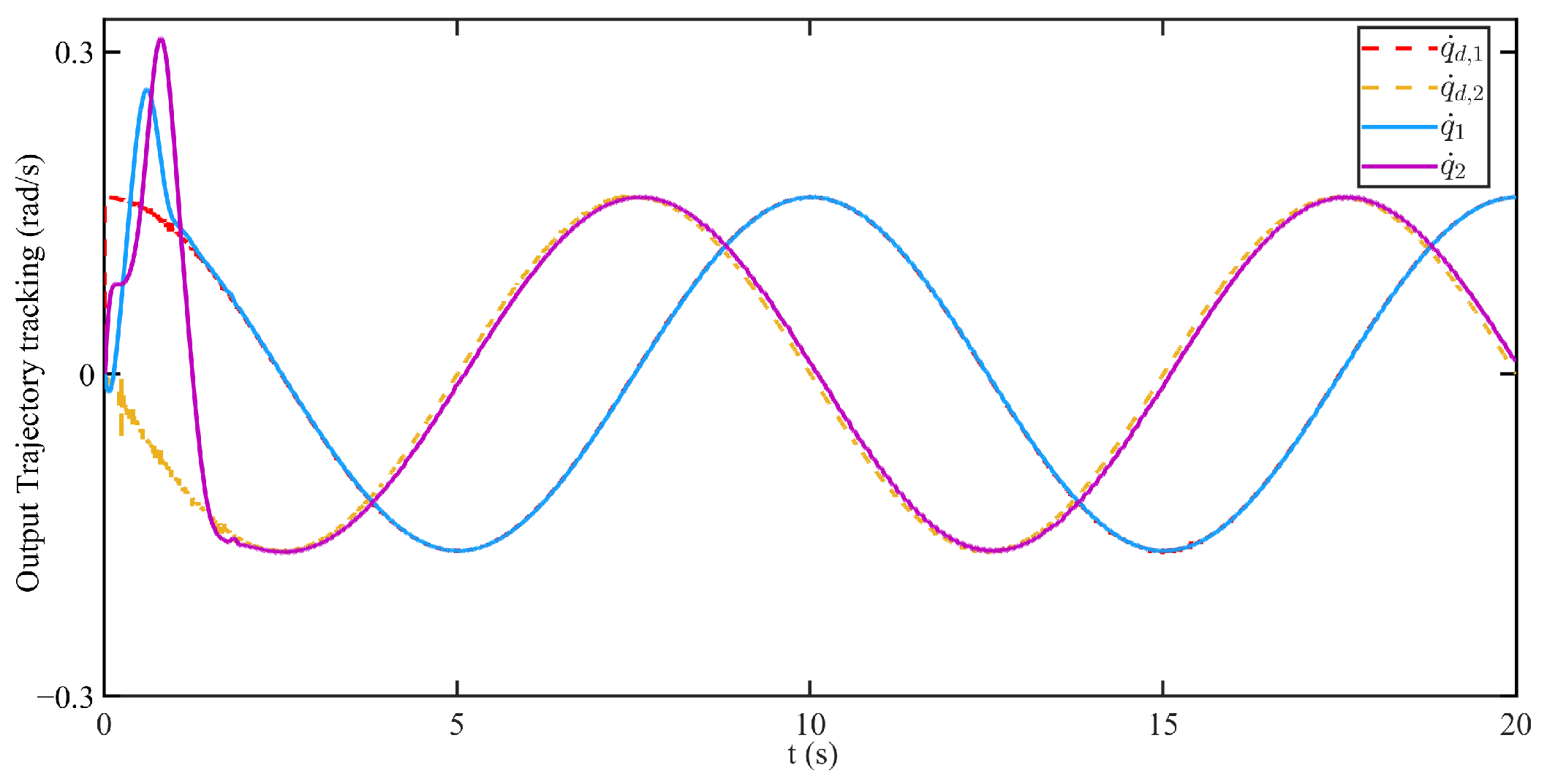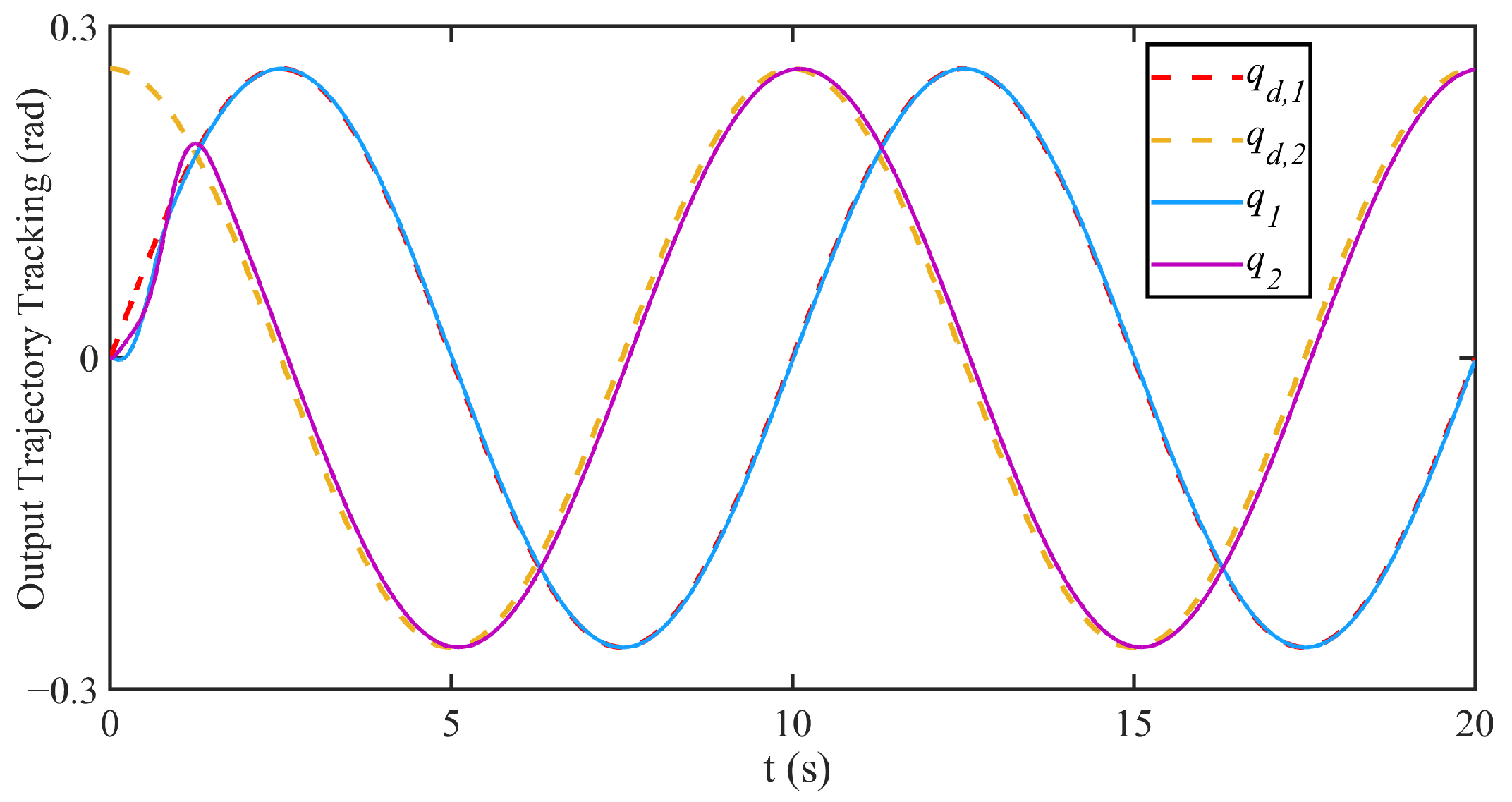 - where , , , , and g, respectively, represent the mass, the length of each link, the moment of inertia, and the acceleration due to gravity. The system parameters are set as = 0.8 [kg], = 0.5 [kg], = 0.4 [m], = 0.2 [m], = 0.6 [kg· m2], = 0.4 [kg· m2], and g = 9.81 [m/s2].