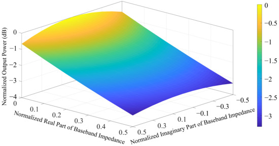 Normalized output power of a class-B PA under balanced concurrent mode versus the real and imaginary parts of the baseband impedance.