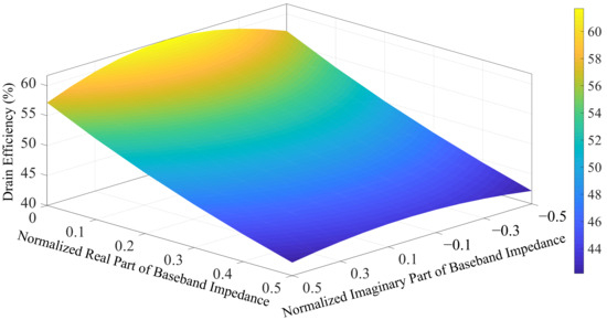 Using (4), the normalized output power of a class-B PA versus the variation in the real and imaginary parts of the baseband impedance is depicted in Figure 2. Note that the output power is normalized to the output power level when the baseband impedance is zero. As depicted in Figure 2, the normalized output power decreases as the real part increases or as the imaginary part deviates from zero. Using (6), Figure 3 depicts the concurrent DE of a class-B PA with respect to the real and imaginary parts of the baseband impedance. From Figure 3, the concurrent DE of a class-B PA also decreases as the real part increases or as the imaginary part deviates from zero. From Figure 2 and Figure 3, when equals 0.5, the concurrent DE of a class-B PA drops from 61.7% to 43.9% and the concurrent output power decreases by 3 dB. Moreover, when compared to the real part of the baseband impedance, the imaginary part exerts a relatively minor effect on the concurrent performances, as shown in Figure 2 and Figure 3. Consequently, when designing a broadband PA, we prefer the baseband impedance to vary along the edge of the Smith chart.