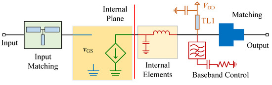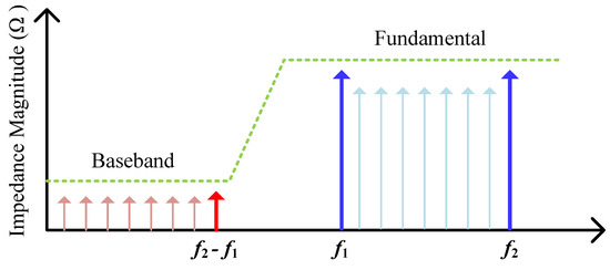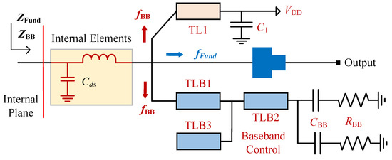 The block diagram of a broadband PA operating under concurrent two-tone CW signal excitation is depicted in Figure 1. Here, we assume the transistor operates in class-B mode and focus solely on the baseband and fundamental frequency components. The transistor within the broadband PA is considered as an ideal voltage-controlled current source accompanied by intrinsic elements. The PA is supplied with a drain voltage denoted as . At the transistor internal plane, the drain-to-source voltage and current are represented by and , respectively.